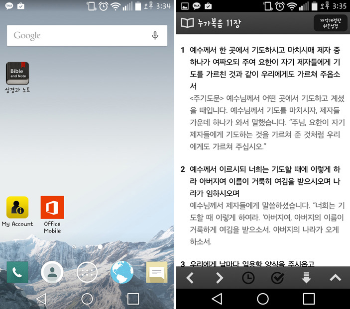 이 사진은 제 핸드폰에 설치되어져 있는 성경과 노트 프로그램입니다.