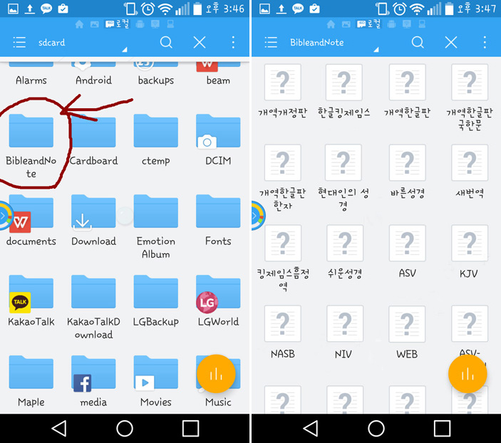 저 위에 보시면,Bible and Note 폴더(붉은 원)가 보이시죠…컴퓨터와 연결해서 폴더를 여시던, 아니면 핸드폰 자체 디렉토리와 폴더를 볼수 있는 프로그램을 사용하시던, 여셔서 zip을 푼 15개의 성경버전들을 저 BibleandNote 폴더 안에 복사하시면 됩니다.