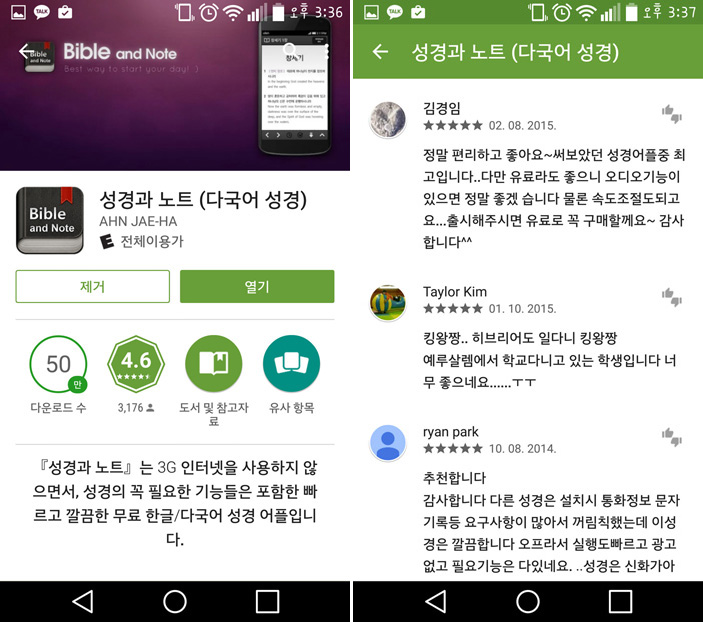'앱스토어'에 가셔서 성경과 노트를 서치하시면,이런 다운로드 화면이 뜹니다. 리뷰에 사용자 모두들 만족해 합니다. 앱 프로그램 중에 이처럼 만족도가 높고 칭찬하는 프로그램은 처음 보았습니다.