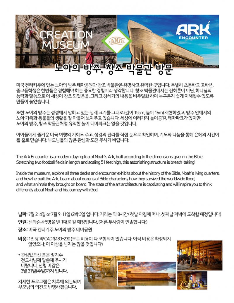 ㆍ주일 설교 영어번역 지원합니다. 카톡으로 설교 내용을 미리 번역, 발송합니다. 원하시는 분들은 누구든지 영어 설교를 받을 수 있습니다. (신청; 민정기 목사, 이영준 청년)