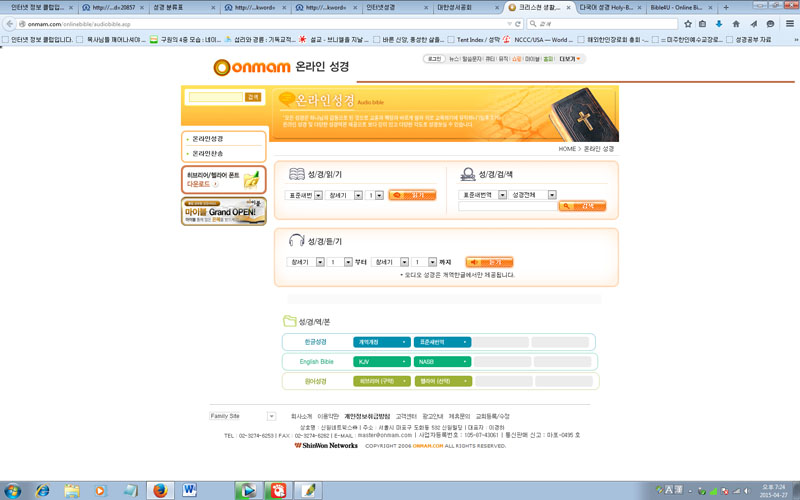 * 온라인 성경들을 올려 봅니다. 이 밖에도 더 많은 것들이 있습니다. 각 성경마다 장잔 점이 있습니다. CTM 인터넷 성경 같은 경우는 쉬운 성경이 있습니다. 대한성서공회 성경을 번역한 대한성서공회 것이구요. onmam 성경은 오디오 듣기가 있어서 올려봅니다. 홀리 바이블은 제가 많이 씁니다 제일 빠르고 군더더기가 없어서요. 바이블4U는 제일 많은 대조역을 가지고 있습니다. 좋은 온라인 성경 싸이트 여러분도 추천해 주세요