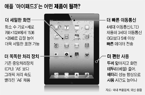아이패드3는 하드웨어 면에서 기존 아이패드2에 비해 대폭적인 향상이 이뤄질 것으로 관측된다. 가장 큰 변화는