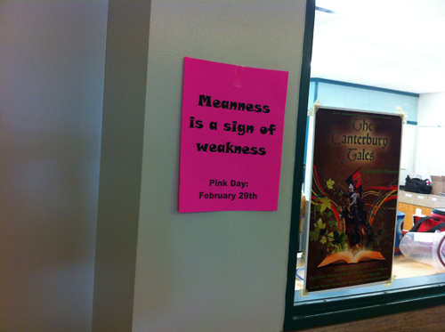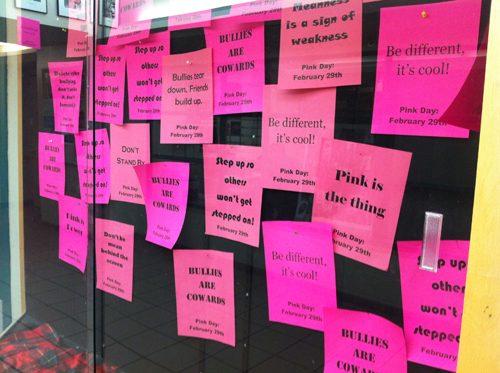 Bullying 에 저항한다는상징으로 “Bullying Stops Here” 라던가, ‘Pink Shirt Day’ 같은 문구가