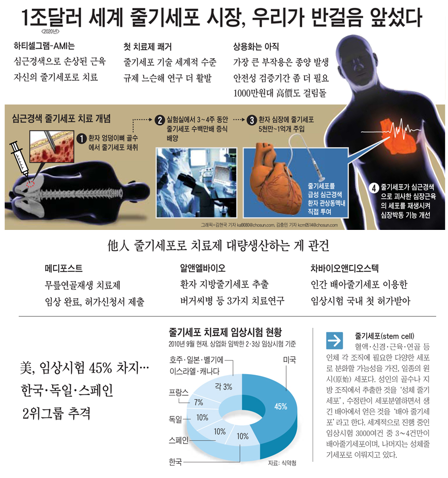 급성심근경색 줄기세포치료제 '하티셀그램-AMI'가 다음달 식품의약품안전청의 허가를 받아 시판되면 우리나라가 세계 줄기세포 시장에서 반발 앞서게 된다. 우리나라의 줄기세포 기술이 세계 수준이고, 미국·영국 등 경쟁국들에 비해 우리 정부가 신속하게 검증해 제품 허가를 내준 결과다. 하지만 다른 나라도 임상 시험 막바지 단계에 있는 줄기세포치료제를 많이 갖고 있어 본격적인 경쟁은 이제부터다
