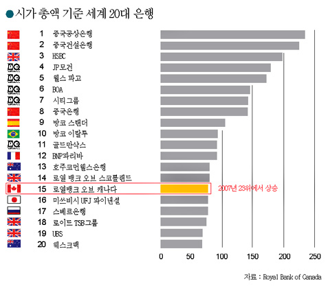 자산규모 세계 30위권(2010 <더 뱅커> 기준 36위)에 해당하는 RBC는 2011년 1월 시가총액 기준 세계 15위를 기록했다. RBC의 시가총액 순위가 자산 기준 순위보다 높은 것은 글로벌 금융위기에도 불구하고 RBC가 견조한 실적을 나타내며 시장의 호응을 얻어냈기에 가능한 것으로 풀이된다.
