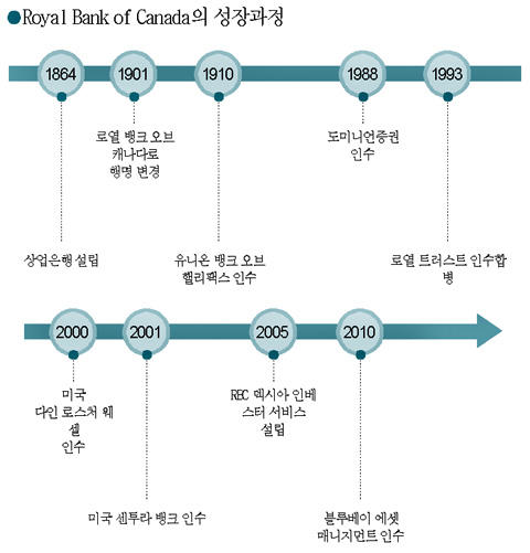 이러한 지속적인 기업 인수와 자생적 성장을 토대로 RBC는 캐나다 금융기관의 리더인 동시에 2010년 기준 52개국, 7만9000명의 직원을 둔 세계적인 금융그룹으로 거듭나게 된 것이다.