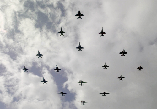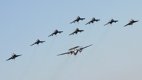 [ 항공모함 드골에 탑재된 라팔, 슈페르 에땅다르, E-2C의 집단 비행